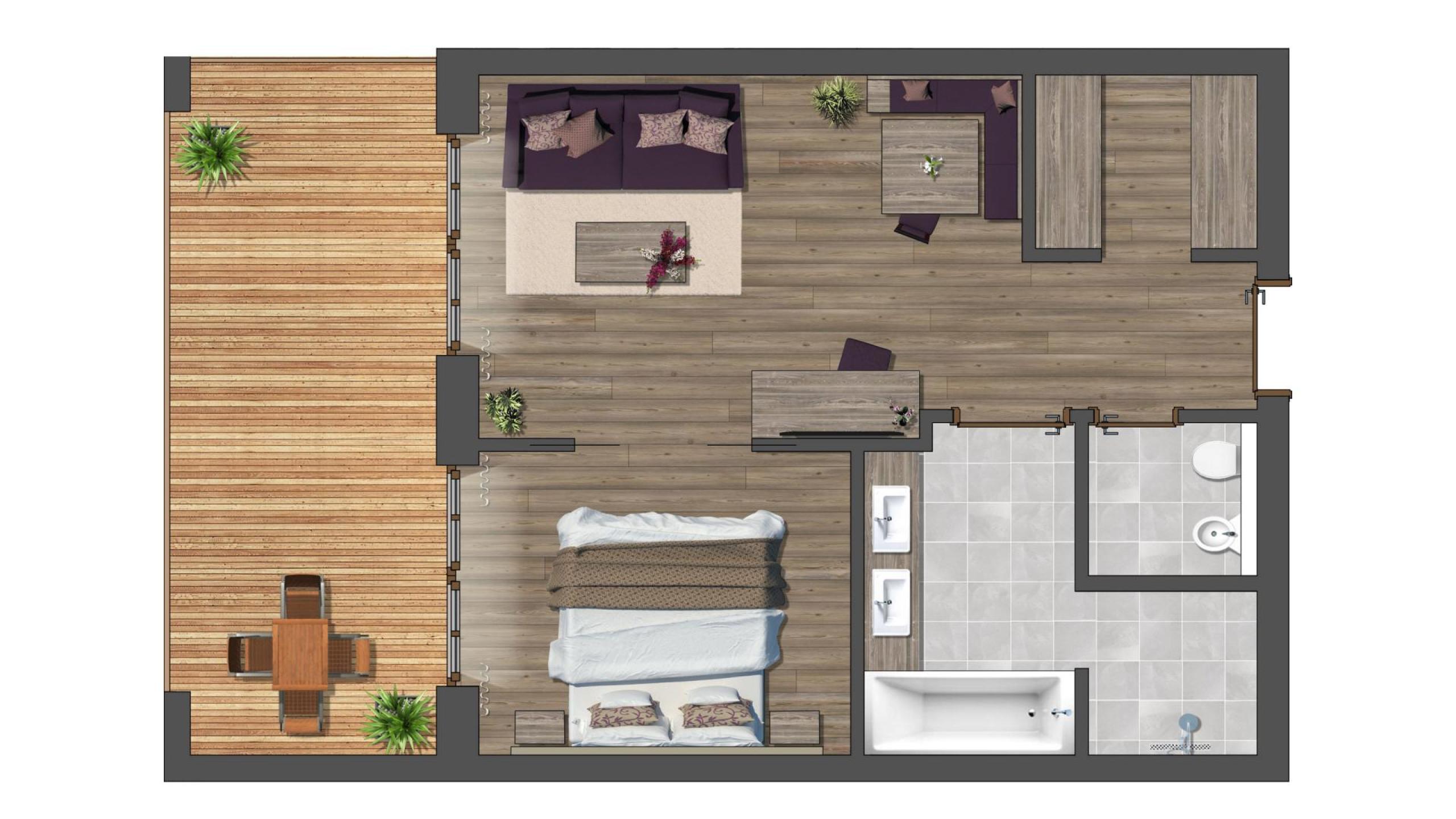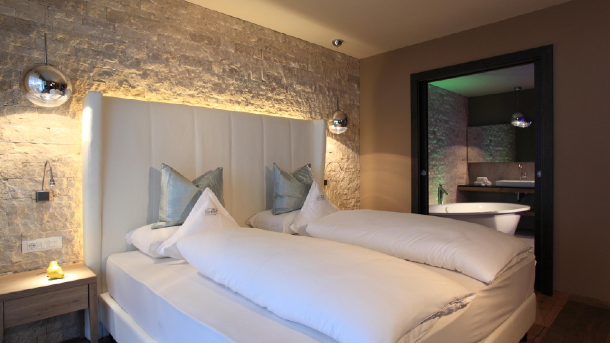 Spacious suite for 2 to 4 people, ca. 65 m², bedroom, large terrace with garden furniture, walk-in cupboard, living room corner with daybed, table and chairs, bathroom with bathtub, shower extra, double washbasin, WC and bidet separate, 2 TVs (satellite), minibar, radio, safe, hairdryer, direct telephone, bathrobe, bathbag, slippers, garage inclusive, W-Lan in the whole building. The pictures are examples of the rooms, these may vary in color and disposition depending on the location in the house.