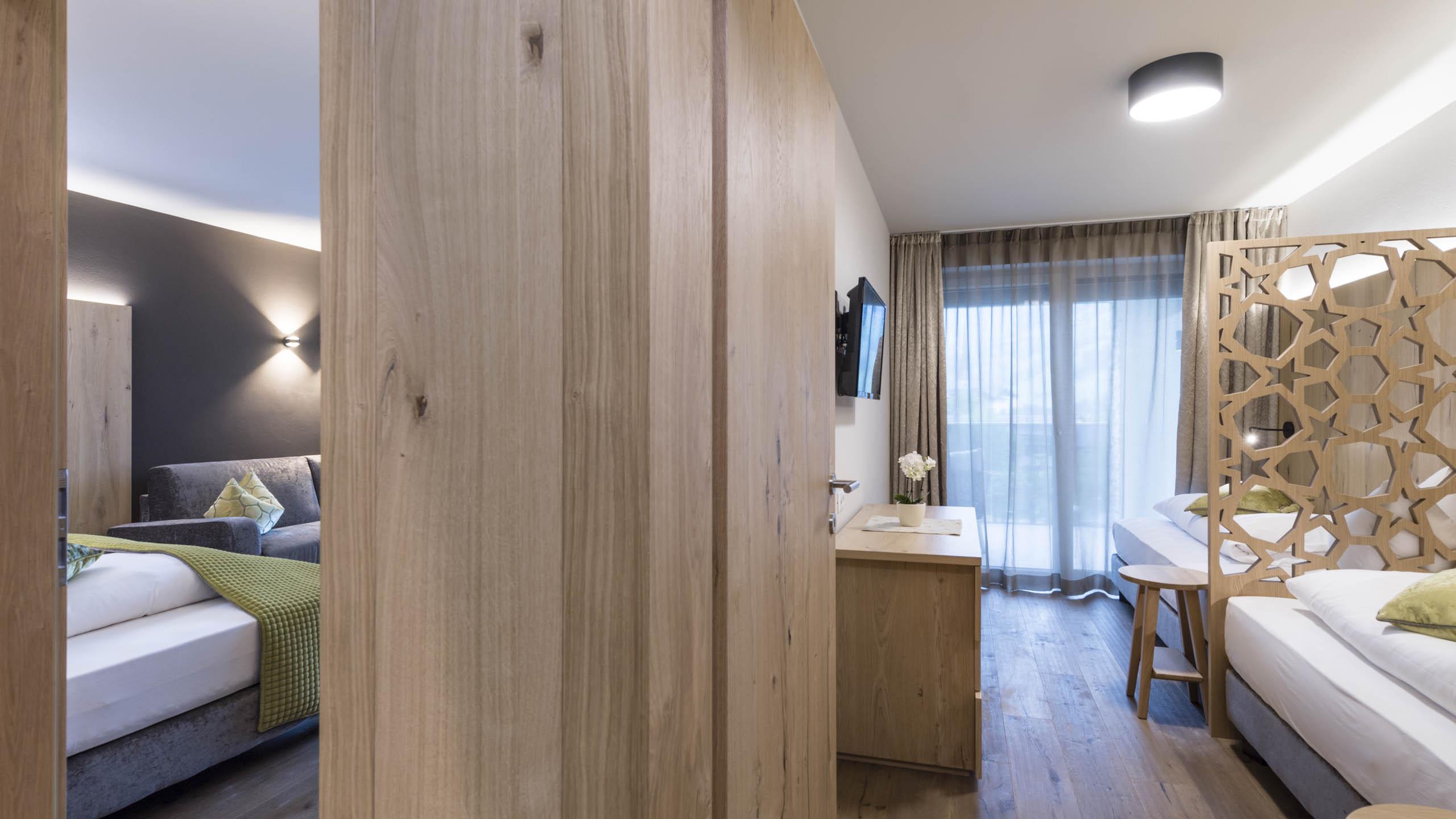 Family suite, ca. 65 m², 2 to 6 person, with 2 separate bedrooms (with connecting door) and living room corner, walk-in cupboard, large terrace with garden furniture, bathroom with bathtub, shower, double washbasin, WC and bidet separate, 2 TVs (satellite), minibar, direct telephone, safe, hairdryer, minibar, bathrobe, bathbag, slippers, garage inclusive, WIFI for free in the whole building. The pictures are examples of the rooms, these may vary in color and disposition depending on the location in the house.