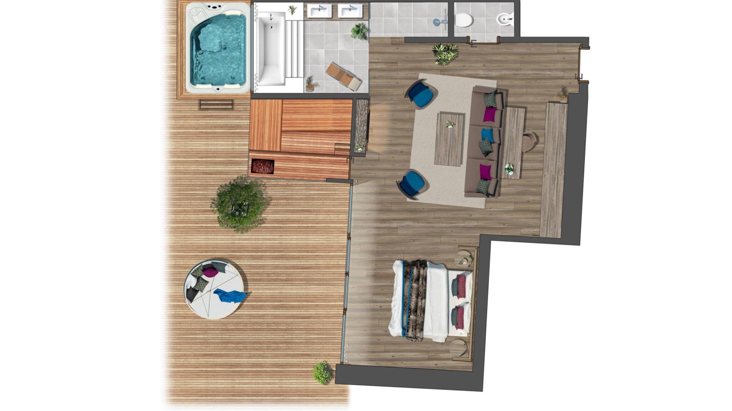 Heaven luxury SPA suite for 2-3 persons, about 65m² inclusive furnished panoramic terrace with garden furniture, cozy double bed, a stylish lounge area in the room, electric fireplace, luxurious bathroom with freestanding bath, separate walk-in shower, separate toilet bidet, double sink, private panoramic sauna, Jacuzzi on the terrace with views of the mountains, TV (satellite), safe, hairdryer, mini bar, direct dial telephone, balcony, bathrobe, beach bag, slippers, including garage space, free WIFI throughout the hotel. The pictures are examples of the rooms, these may vary in color and disposition depending on the location in the house.